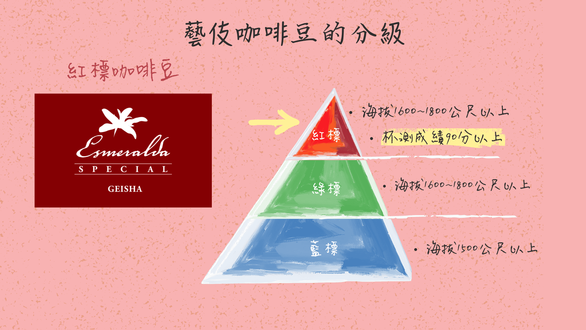 「紅標」Red Label是對 Geisha 咖啡的最頂級分級系統。紅標批次主要來自海拔 1,600–1,950 米以上(部分達 +1,950m)的精選微批次(如 Jaramillo、Cañas Verdes、Fundador 等高山區塊),杯測分數需達 90 分以上(常 91+)。這些批次來自莊園最優質地塊,產量極稀,部分直接參與年度 Esmeralda Special 拍賣會,以高價落槌,代表全球 Geisha 的巔峰品質。相較綠標(Private Collection,87–90 分左右)與藍標(Geisha 1500,海拔較低),紅標象徵嚴格篩選下的「皇冠級」風土精華,是精品咖啡愛好者追逐的終極傳奇。