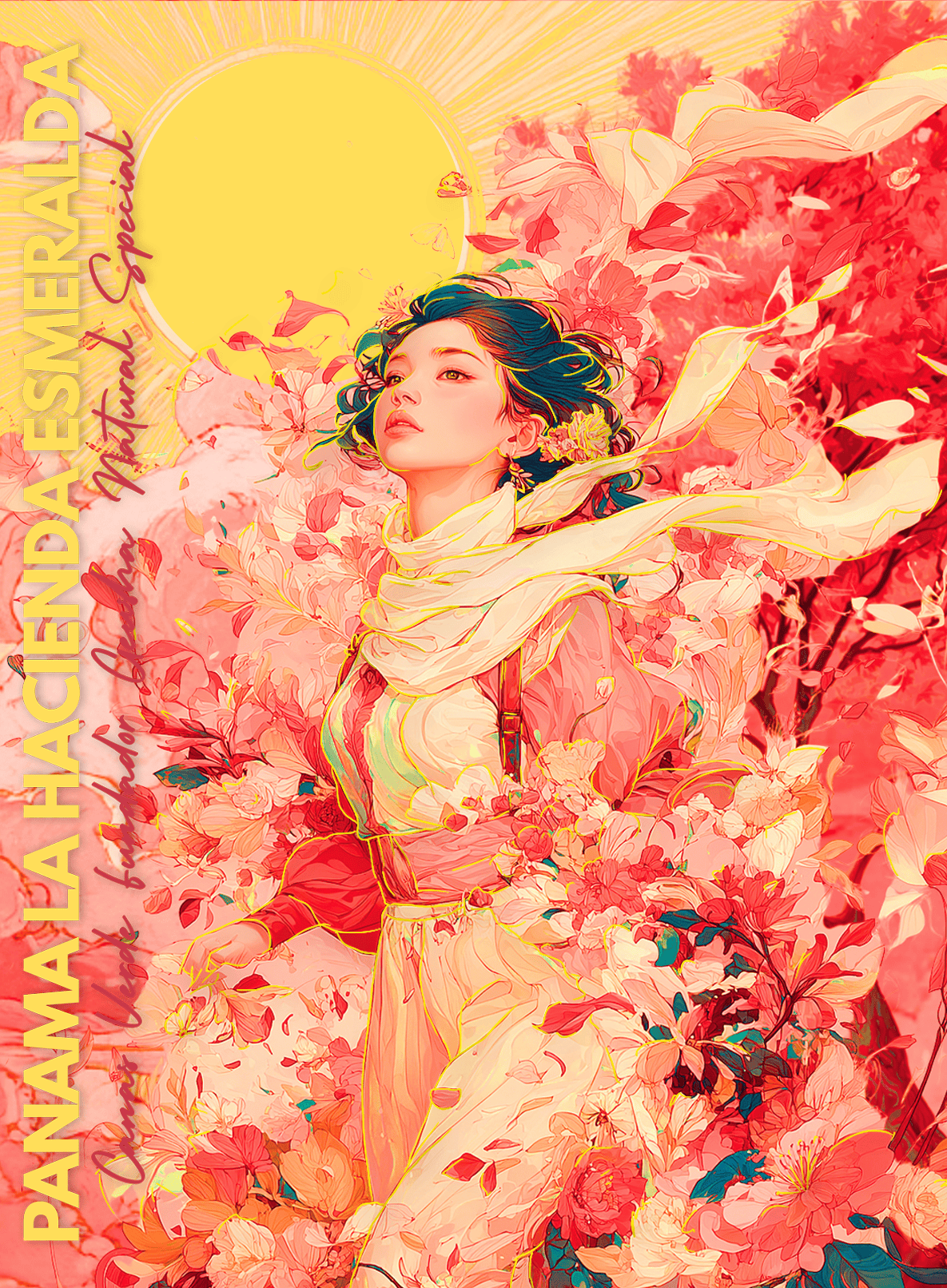 包裝以粉紅橘夕陽為基調,宛如Fundador區塊高山日落,中央一位白髮少女身披紅葉圍巾,頭頂金黃太陽,肩上白鸚鵡象徵Geisha的異國優雅與自由。紅楓與櫻花枝葉環繞,呼應石果、杏子與鳳梨的溫暖果香;茉莉般的柔美少女氣質則連結茉莉花芬芳。整體的風格融合東方詩意與熱帶浪漫,象徵這批紅標Special Natural從高山雲霧中綻放的「春晨破曉」——少女如Geisha豆般純淨迷人,鸚鵡代表稀有與異域風情,邀請品嚐者沉浸在Fundador的熱帶花園夢境中,讓每一次開啟都像迎接一場日出般的奢華感官之旅。